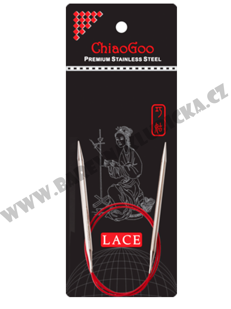 pevné kruhové jehlice Chiaogoo řada Lace nejkvalitnější pletací jehlice vyrobené z chirurgické nerezové oceli se strojově přesnými špičkami. Lanko jehlic Chiaogoo Lace nejkvalitnější lanko bez paměťového efektu. Lanko je složeno z několika ocelových lanek potažených červeným nylonem. Přechod na lanko je neskutečně hladký, příze nikde nezadrhává. Velikost jehlic je na každé jehlici vygravírovaná laserem.