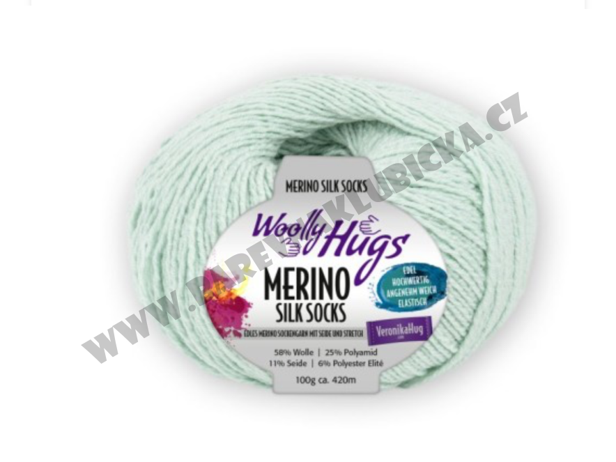 Woolly Hugs Merino silk socks je luxusní jednobarevná ponožková příze. Jedná se o směs prvotřídních materiálů 58% vlny a 11% hedvábí dodává přízi měkkost a hladkost, 6 Polyesteru Elité a 25% polyamidu větší odolnost a pružnost. Přízi můžete použít na svetry, šátky, šály, rukavice a samozřejmě ponožky. Ponožková příze Woolly Hugs Merino silk socks má speciální úpravou, která umožňuje upletené ponožky prát v automatické pračce (doporučujeme program na vlnu bez aviváže, sušit vodorovně).